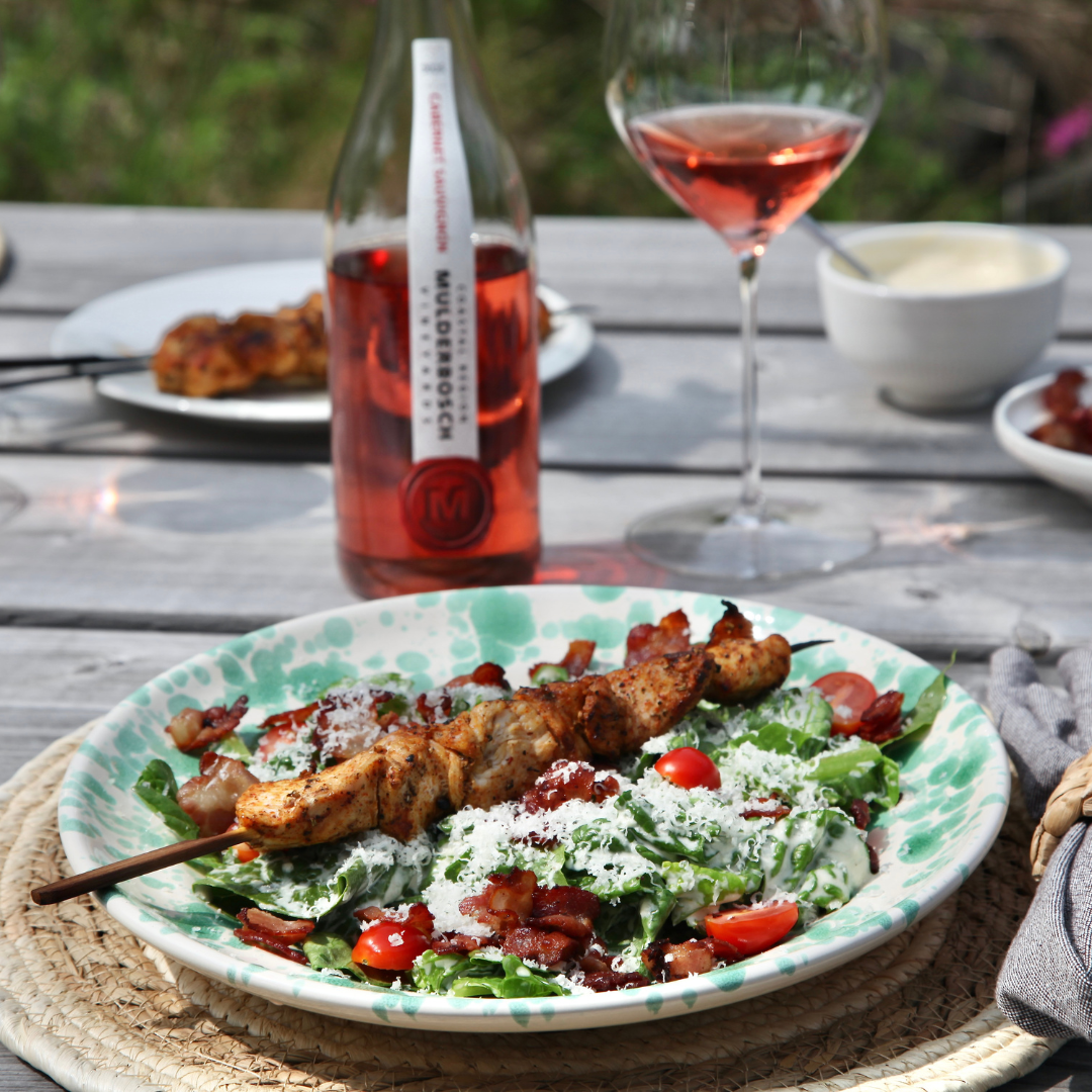 8. Grilla kycklingspetten tills kycklingen är genomstekt. Servering Häll av vattnet från salladen och vänd upp med önskad mängd Caesardressing. Lägg upp på tallrikar och toppa med tomater och knaperstekt bacon. Lägg kycklingspett på varje sallad och riv över massa parmesan. Servera till ett glas Mulderbosch Rosé.
